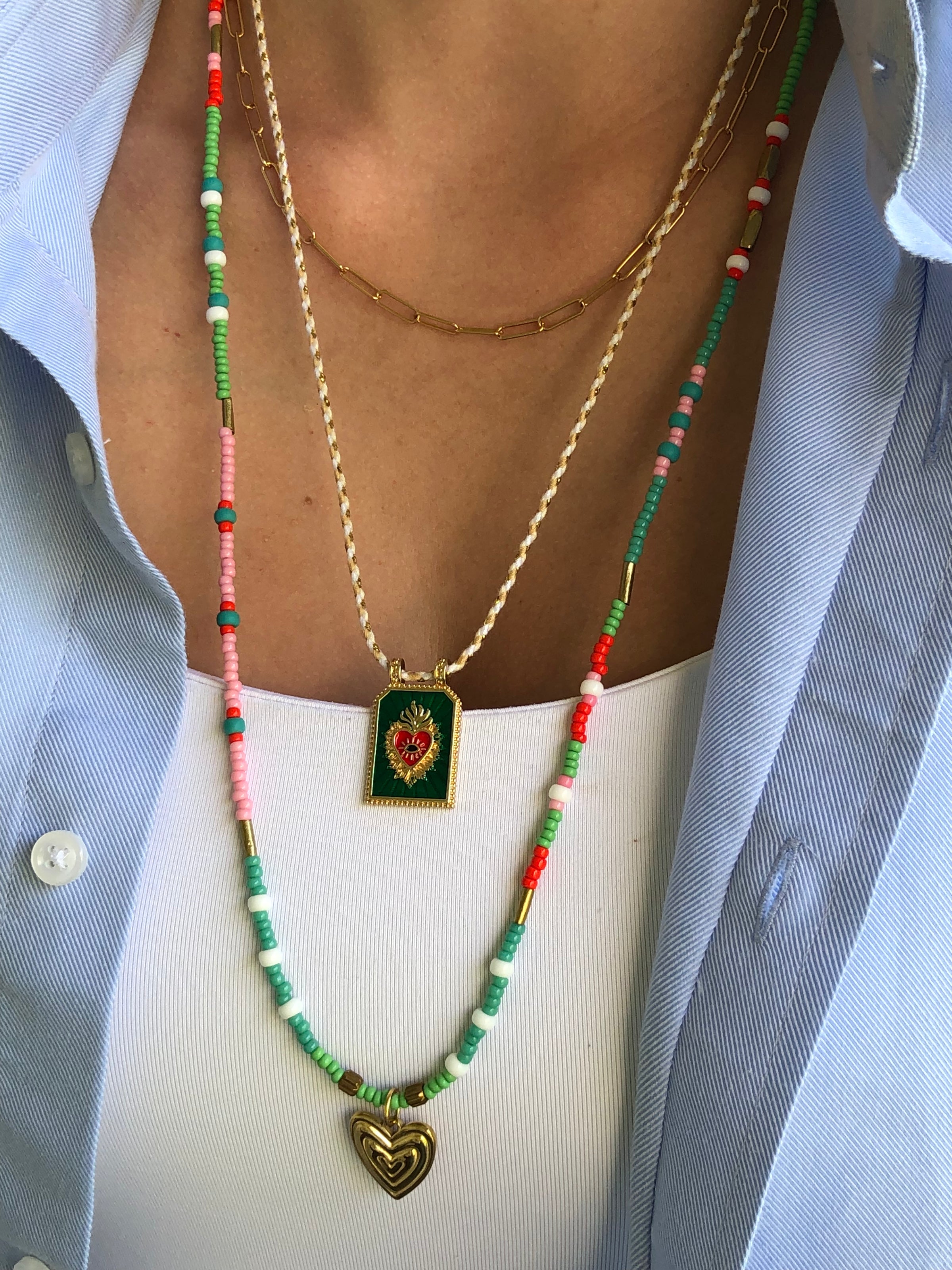 Ketting van koord met rvs hoekige kralen en Gold-plated groen amulet met roze hart.