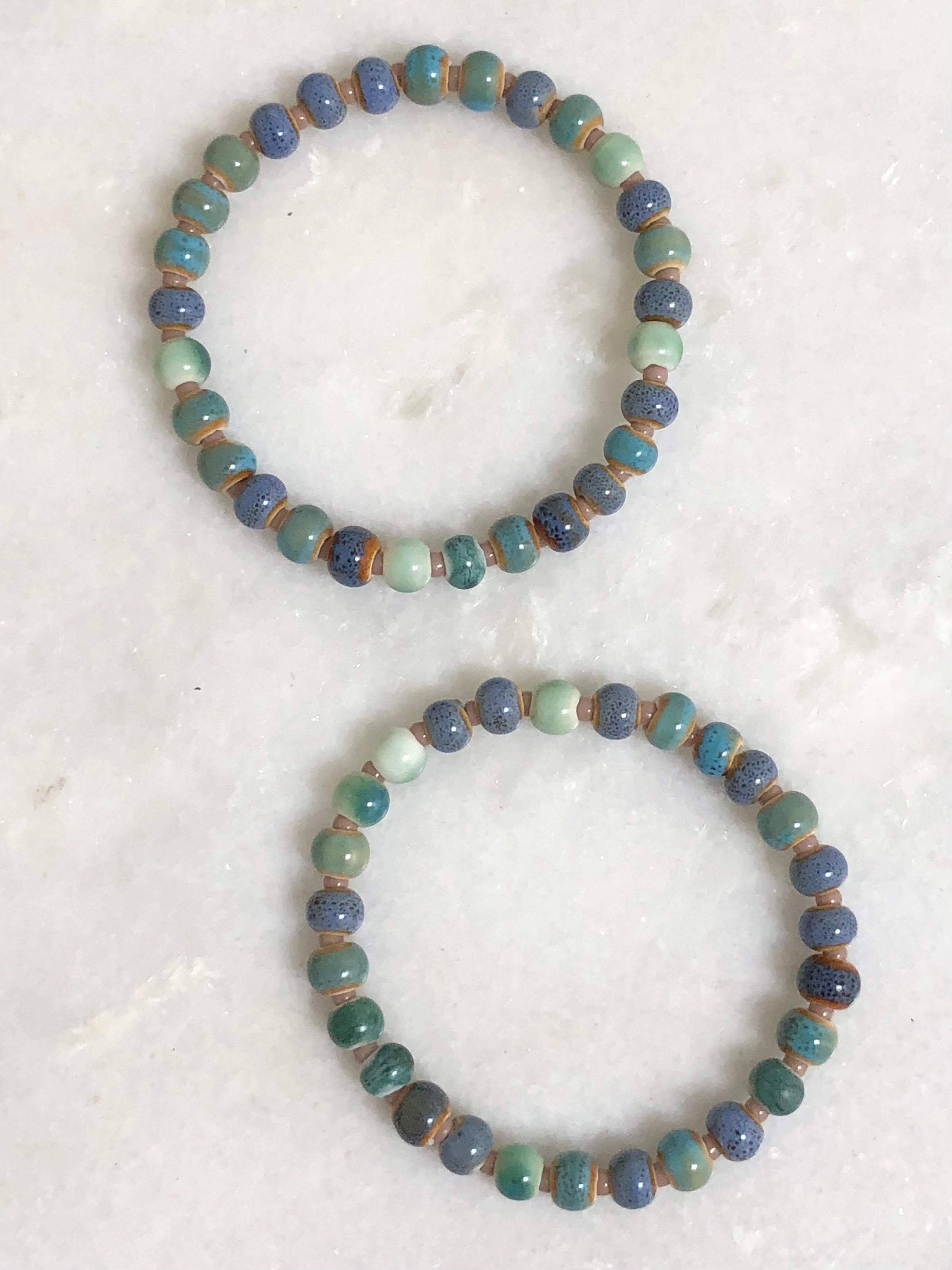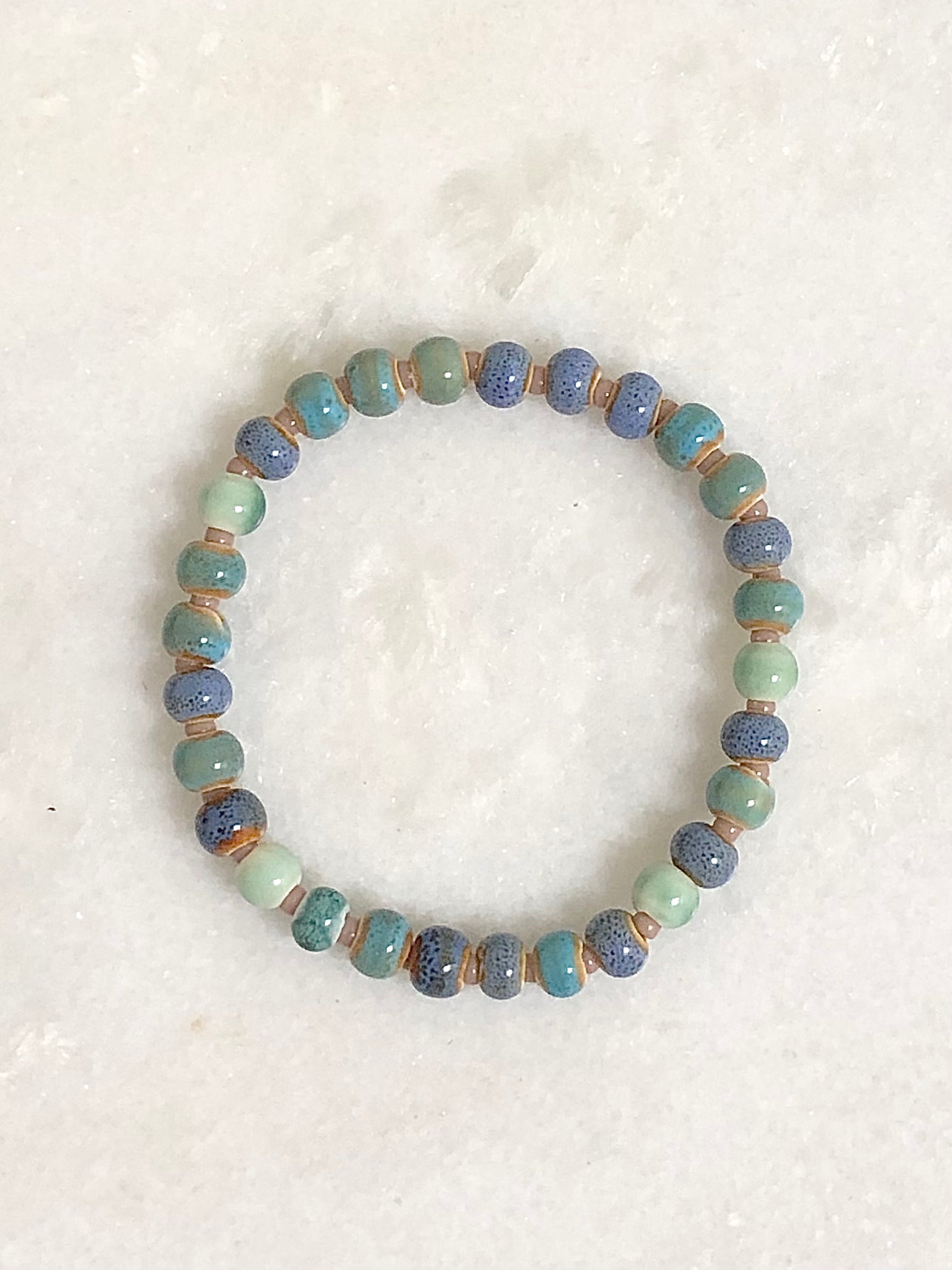 Stretch armband van geglazuurde, keramische kraaltjes (doorsnede ongeveer 0.5cm) in groen en blauw tinten.
