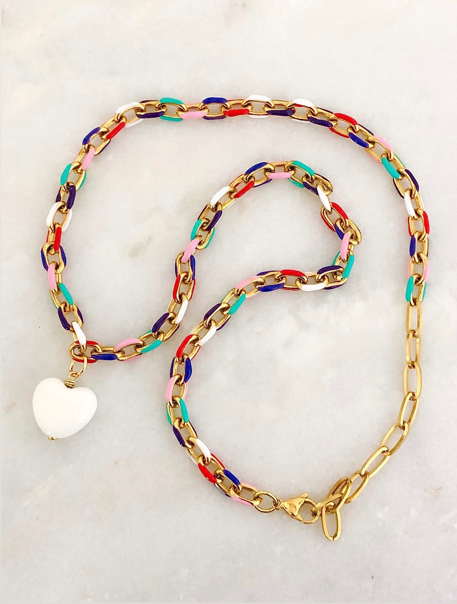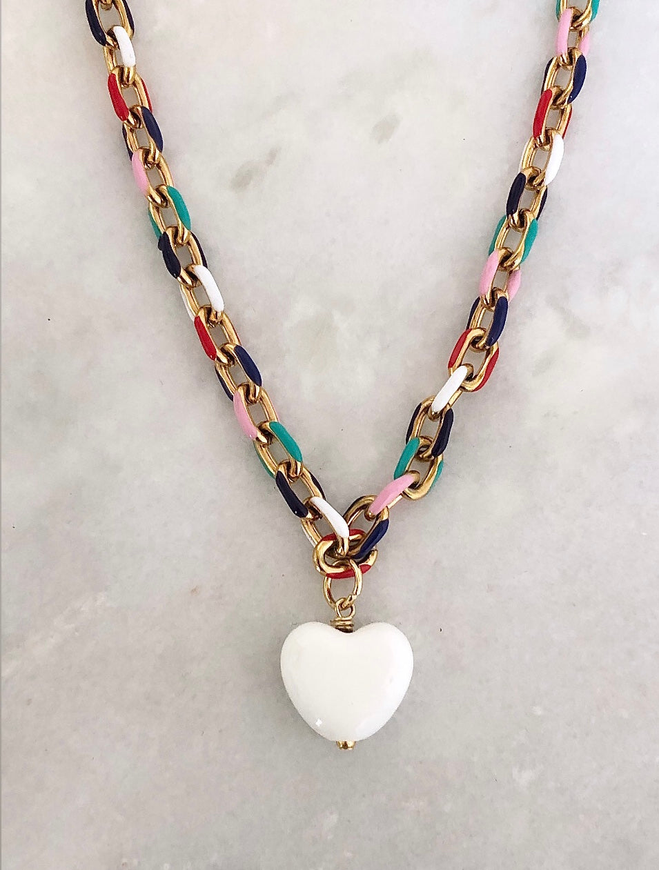 Rvs ketting met emaille schakels in roze ,rood, wit, turquoise en donkerblauw met wit hart van keramiek